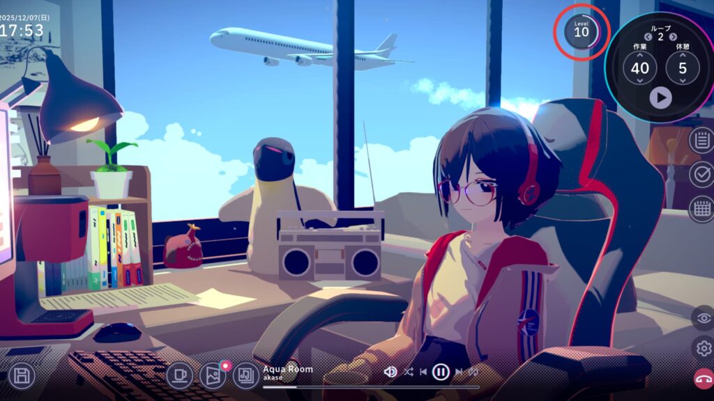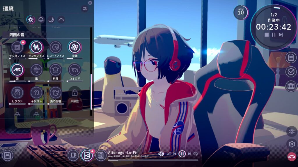 レベルアップすると何が起こるのかと言えば、環境音に設定できるものが増えたり、窓の外の景色をどうするのかといった部分が選べるようになる。